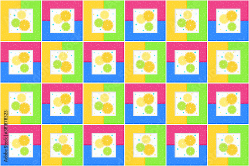 ceramic, tile, tiled, tile, tiling, citrous, fruit, lime, orange, lemon, grapefruit, mandarin, slice, food, fruity, juicy, piece, sliced, square, round, rectangular, rectangle, seamless, pattern, continuous, repeat, endless, vector, design, art, graphic, print, paper, surface, texture, carpet, rug, carpeting, floor, kitchen, wall, colourful, many-coloured, many-coloured, bright, background, decor, decorative