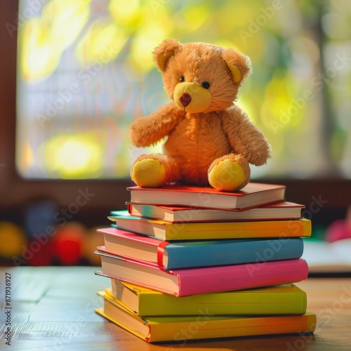 Colorful Stack of Children's Books with Bear Toy