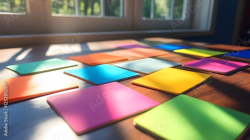 sticky, note, colourful, paper, office, workspace, organisation, productivity, creativity, planning, arranging, communication, idea, writing, stationery, minimalist, modern, decor, sunlight, table, background, design, casual attire, text, reminder, colours, neat, contrast, perspective, square, shadow, indoor, bright, vibrant, schedule, education, brainstorming, inspiration, tool, material, home, neatness, layout, essential
