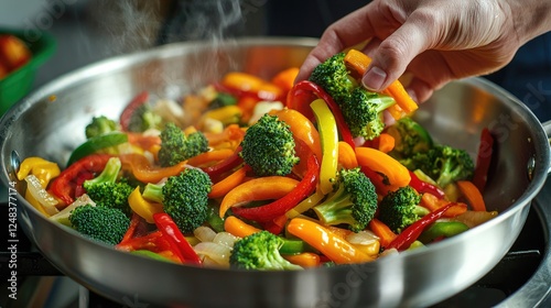 vegetable, broccoli, pepper, stir fry, cooking, hand, colourful, healthy, fresh, meal, preparation, kitchen, culinary, steam, organic, green, yellow, red, bell pepper, vibrant, food, alimentary, tasty, epicure, cookery, dinner, ingredient, receipe, food photography