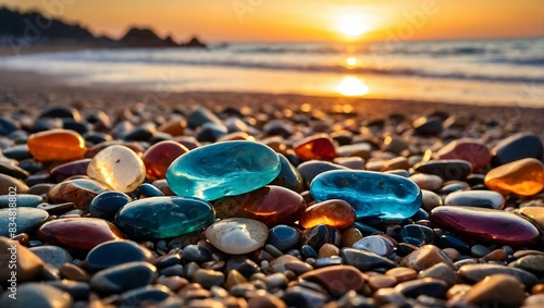 Colorful stones on the beach at sunset background