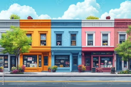 Colorful storefronts line a charming street showcasing vibrant architecture and inviting windows