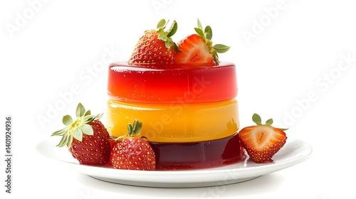 colorful strawberry jelly dessert with layers of fruit jelly and fresh strawberries isolated on white background perfect for party snacks, refreshing sweets, and summer-themed food styling