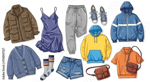 Colorful Stylish Clothing Collection Featuring Jackets, Dresses, Hoodies, and Accessories