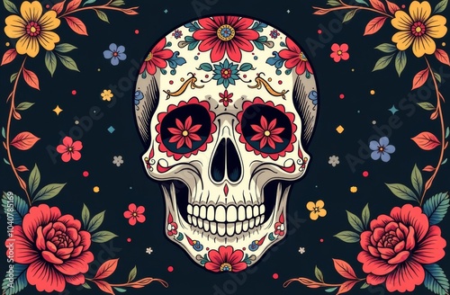 Colorful sugar skull decorated with flowers and intricate designs, symbolizing the Day of the Dead celebration in a vibrant style