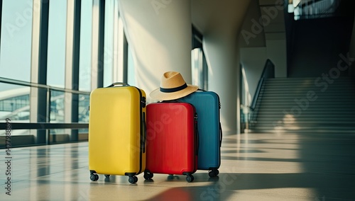 suitcase, suitcase, baggage, travel, aerodrome, departure, journey, vacation, holiday, summer, travel bag, baggage, colourful, yellow, red, blue, hat, leghorn, waiting, terminal, modern, architecture, interior, building, transportation, tour tourism, trip, get-away, adventure, explore, wanderlust, globetrotter, passenger, flight, destination, traveler, packing, ready, escape, relax, summer getaway, bright, stylish, advertising, smart