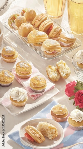 Colorful sunday brunch with mini sandwiches and cupcakes outdoor setting food bright daylight