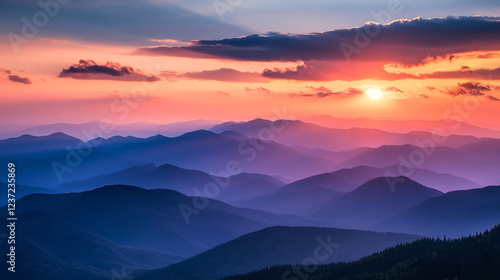 Colorful sunset over rolling mountain ridges with misty blue and pink hues in the sky creating a dreamlike and peaceful atmosphere
