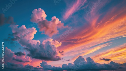 Colorful sunset sky with clouds in various shades of pink, orange, and blue, perfect for backgrounds or nature-themed projects, Copy Space