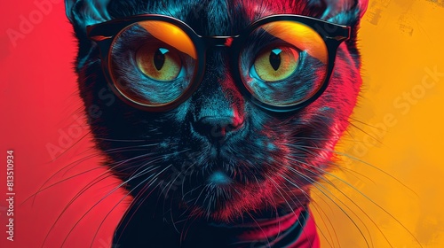Colorful Surreal Pop Art Portrait of a Cat Wearing Glasses Against a Dual-Toned Background