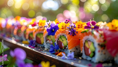 Colorful Sushi Rolls with Edible Flowers on Wooden Board