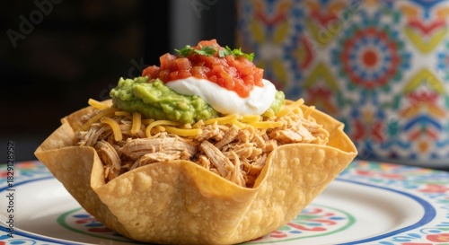 taco, salad, tortilla, bowl, food, cookery, mexican, guacamole, salsa, cheese, chicken, shredded, crispy, fresh, tasty, delicious, vibrant, colourful, plate, closeup, ingredient, dining, meal, lunch, dinner, feast, party, gathering, family, celebration, texture, sharpened, background, design, pattern, art, healthy, lifestyle, eatery, cooking, eating, snack, presentation, garnish, tradition, southwest, style