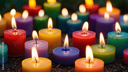 candle, colourful, warm, glow, light, flames, burning, vibrant, illuminated, many-coloured, warmth, ambience, evening, night, setting, closeup, small, round, group, many, variety, colours, red, orange, yellow, green, blue, purple, pink, wax, flickering, romantic, peaceful, relaxing, cosy, atmosphere, decorative, celebration, festive, event, illumination, sparkling, soft, gentle, warm tones, various