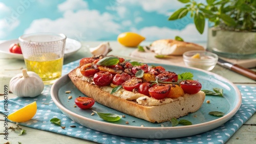 Colorful Tomato Focaccia Served on a Ceramic Plate with Garnishes