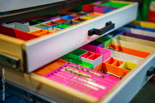 Colorful tool drawer. Putting things in order. Partitions and dividers. Home workshop.