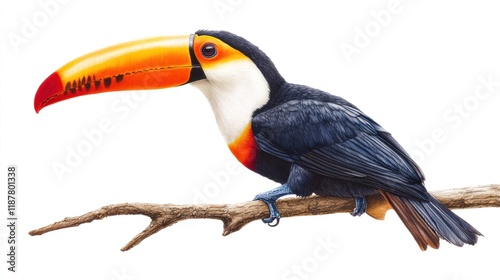 Colorful Toucan Perched on Branch Against White Background, Beautiful Bird Portrait