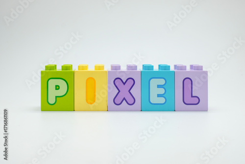 Colorful toy blocks spelling the word PIXEL on a white background. Perfect for technology, education, and creative design projects. Ideal for advertising, presentations, and digital campaigns
