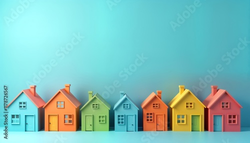 Colorful toy houses line up against pale blue background. Miniature homes show different colors. Illustration evokes sense of community, childlike joy. Ideal for children book education project.