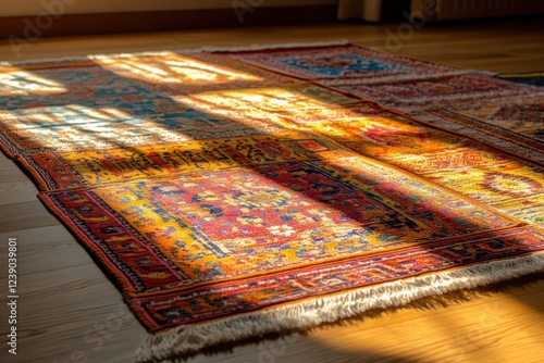 Colorful Traditional Rug Casting Shadows on Wooden Floor in Sunlight