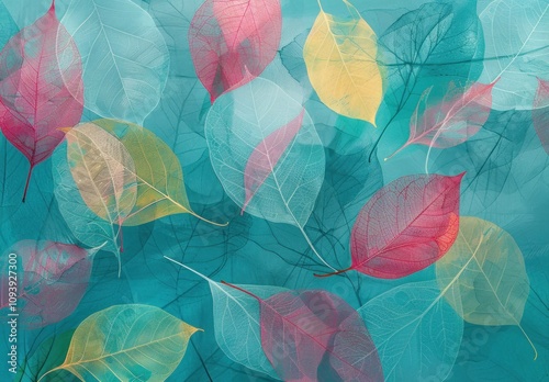 Colorful translucent leaves floating on a turquoise background, creating a soft and dreamy atmosphere. Nature and abstract design concept.