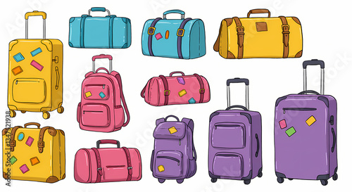 baggage, suitcase, bag, travel, vacation, journey, adventure, trip, holiday, colourful, bright, various, collection, set, illustration, design, graphic, vector, cartoon, cute, pastel, yellow, purple, pink, blue, turquoise, accessory, packing, aerodrome, tour tourism, wanderlust, explorer, traveler, backpack, carry-on, sticker