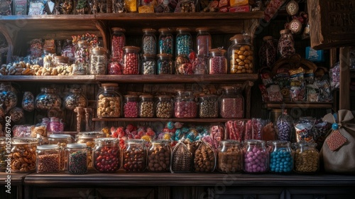 store, shelf, jar, bag, treat, sweet, snack, colourful, filled, view, angle, low, display, candy, product, variety, arrangement, rustic, wooden, background, shopper, boutique, confectionery, delicate, hand-made, detail, texture, bright, vibrant, glasses, cardboard box, fun, decor, old-fashioned, small, assortment, market, local, design, retro, tradition, natural, artisan, candy, container, food, retail