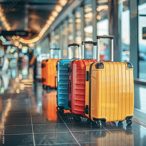 Colorful trip luggage at the airport, vacation luggage waiting in departure lounge area hall of ​airport, terminal