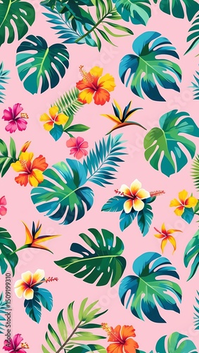 tropical, pattern, flower, leaf, pink, design, greenery, colourful, nature, botany, floral, decorative, exotic, art, background, aesthetic, illustration, textile, wall, summer, vacation, bright, beautiful, print, paradise, palm, hibiscus, monstera, flora, fauna, celebration, island, coastal, cheerful, unique, stylish, modern, lively, natural, foliage, colours, palette, happiness, creativity, fresh, plant, vintage