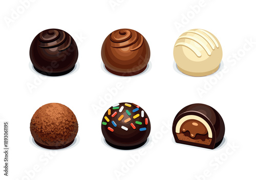 Colorful Truffle Icons. Chocolate truffles. Isometric flat vector icons set of chocolate truffles: dark chocolate truffle, milk chocolate truffle, white