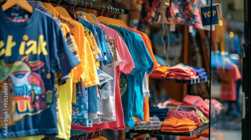 t-shirt, t-shirt, shirt, shirt, clothing, apparel, fashion, retail, store, shop, display, rack, hanger, hanger, sale, discount, clothing store, display window, colourful, bright, vibrant, pattern, design, yellow, blue, red, pink, orange, green, casual attire, summer, spring, casual clothes, style, trendy, shopping