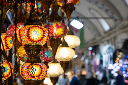 Colorful Turkish lamps or Ottoman lanterns. Souvenir lanterns for sale in the Grand Bazaar. Istanbul, Turkey. Colorful Lanterns.