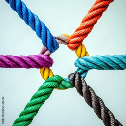 Colorful twisted ropes intertwined on a light background, representing teamwork, unity, strength, and interconnectedness in creative design and visual metaphors.