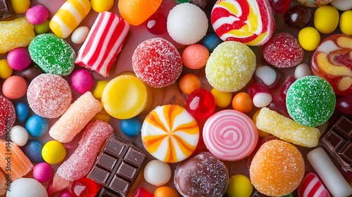Colorful Variety of Candy Mix Lollipops, Chocolate, Jellies, and Sugar Coated Sweets
