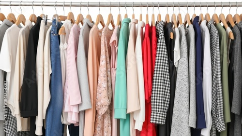 Colorful variety of hanging clothes on a rack displaying fashion diversity