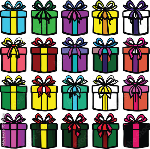 gift, present, box, ribbon, bow, colourful, assortment, collection, pattern, repetition, grid, symmetric, row, column, blue, green, purple, yellow, white, pink, red, black, illustration, graphic, design, art, celebration, birthday, holiday, festive, surprise, giving, receiving, decoration, party, occasion, isolated, white background