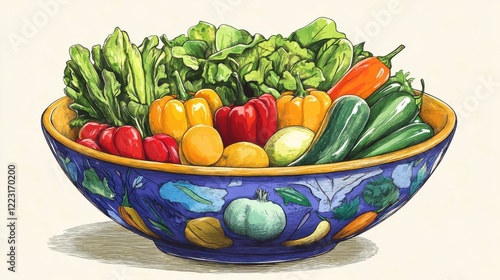 vegetable, bowl, decorative, leafy, pepper, colourful, greener, cucumber, tomatoes, healthy, fresh, nourishment, assortment, art, vibrant, yellow, red, orange, green, illustration, display, garden, harvest, organic, delicious, culinary, edible, decor, cookery, ingredient, vegetarian, vegan, food, natural, farm, produce, platter, diet, crisp, bountiful, alimentary, raw, bright, seasonal, artistic