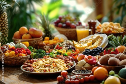 Colorful Vegetarian Dishes on Dining Table. Healthy Plant Based Meal Set on Wooden Table.