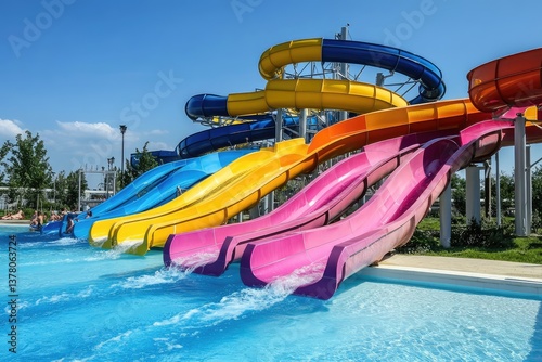 slide, colourful, fun, theme park, adventure, pool, splash, attraction, recreation, leisure, vibrant, entertainment, thrill, ride, playground, amusement, aquatic, slide, family, adrenalin, active, vacation spot, excitement, poolside, joy, speed, wave, summer fun, sunny, resort, park, cool, hot, ai