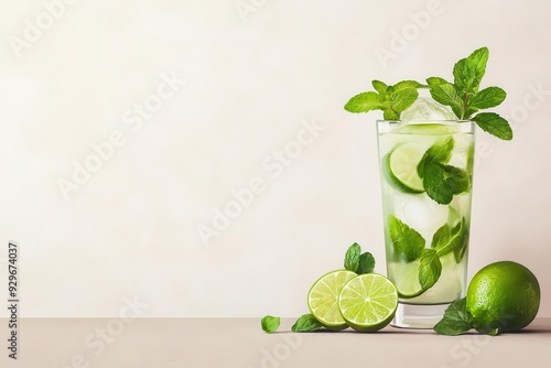 Colorful watercolor depiction of a mojito, with fresh mint leaves and lime slices, set against a subtly textured background