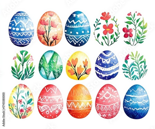 Colorful Watercolor Easter Eggs Decorated with Flowers and Patterns