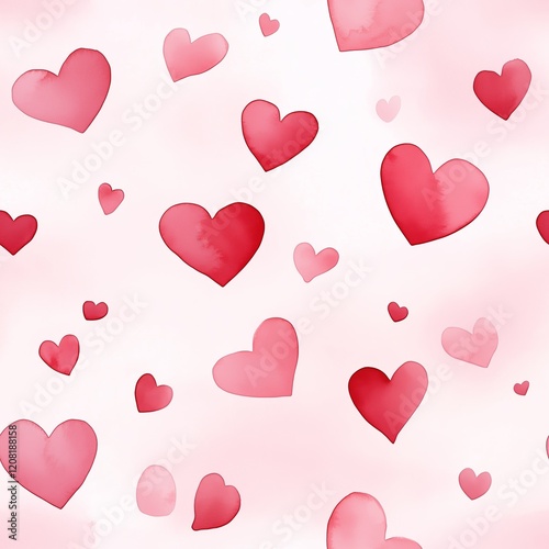 Colorful watercolor hearts scattered against a soft pink background create a romantic atmosphere