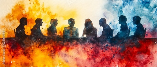watercolor, illustration, colourful, silhouette, people, meeting, discussion, art, creativity, background, vibrant, modern, design, abstract, composition, shadow, group, contrast, dramatic, visual, concept, dialogue, teamwork, collaboration, inspiration, emotional, expression, light, shape, style, artistic, scenery, colours, unique, fantasy, vignetting, technique, representation, expressionism
