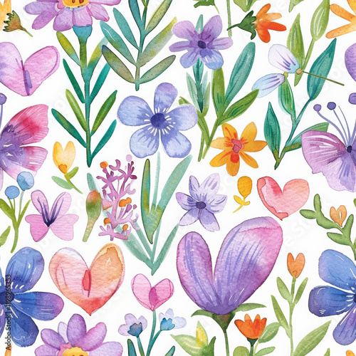 Colorful watercolor pattern featuring spring flowers and hearts