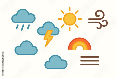 Colorful weather icons: sun, wind, clouds, rainbow, lightning, rain