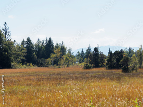 Colorful wetlands and moors meadows around Kirchsee lake in summer. Nature reserve Ellbach-Kirchseemoor by Sachsenkam in Upper Bavaria (Germany)
