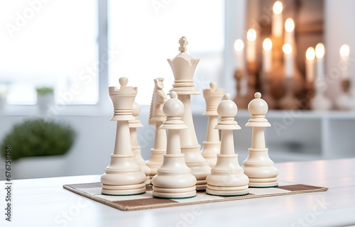 colorful white and beige chess on chessboard on white wooden table competition concept soft light