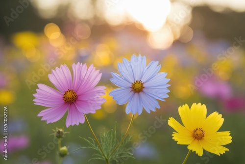 Colorful wildflowers blooming in a meadow with a sunny bokeh background
