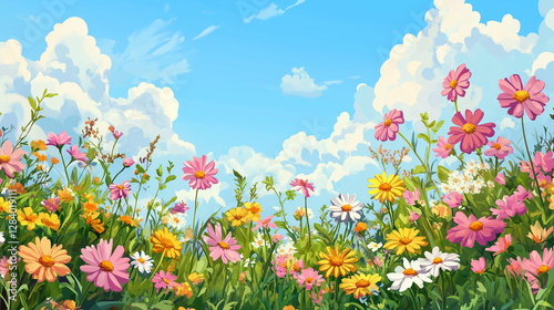 Colorful wildflowers in full bloom on a blue sky background with copy space, in a banner format. Colorful wild flowers like daisies, corn marigolds, coneflowers, geraniums, cosmos, and zinnias