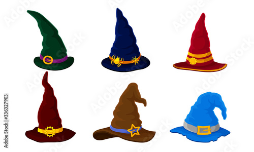 Colorful Witch and Wizards Hat with Belt and Pointed Cap Vector Set