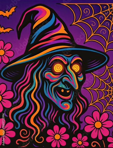 colorful witch illustration with bright spiraled eyes, surrounded by flowers and spider webs, capturing the essence of Halloween and spooky festivities